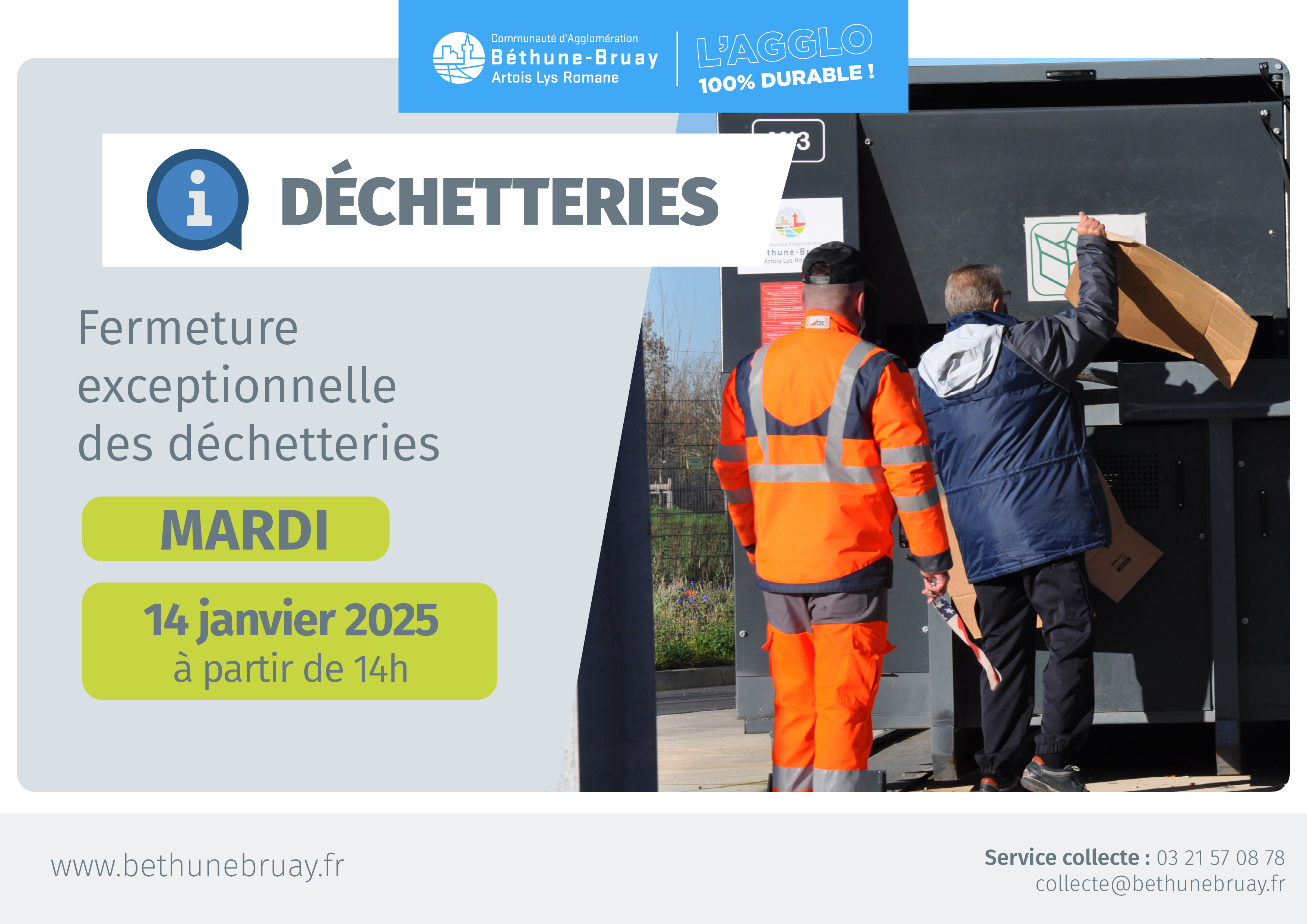 Collecte des déchets Fermeture des déchetteries le 14 janvier après-midi Les déchetteries du territoire seront exceptionnellement fermées le mardi 14 janvier à partir de 14h. Publié le 3 janvier 2025 Nous vous remercions pour votre compréhension. Pages associées Déchetteries Réparties sur l’ensemble du territoire, l’agglomération met à dispositions : 7 déchetteries réservées aux particuliers, 4 déchetteries mixtes (particuliers et professionnels) déchetterie… Precedent Retour à la liste Suivant