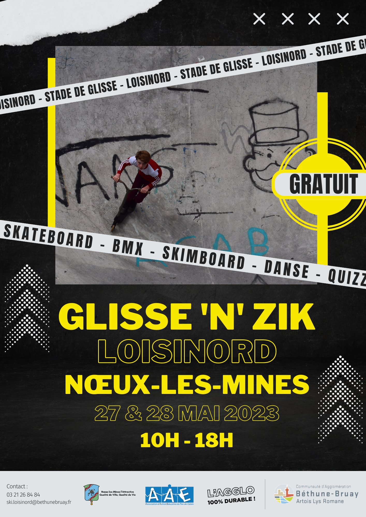 L'événement Glisse’N’Zik revient cette année pour une nouvelle édition ! Organisé par l'agglomération Béthune-Bruay, cet événement gratuit aura lieu les 27 et 28 mai 2023 de 10h à 18h. Pour cette édition, l'événement se délocalise au stade de glisse pour une nouvelle aventure pleine de surprises et d'activités.