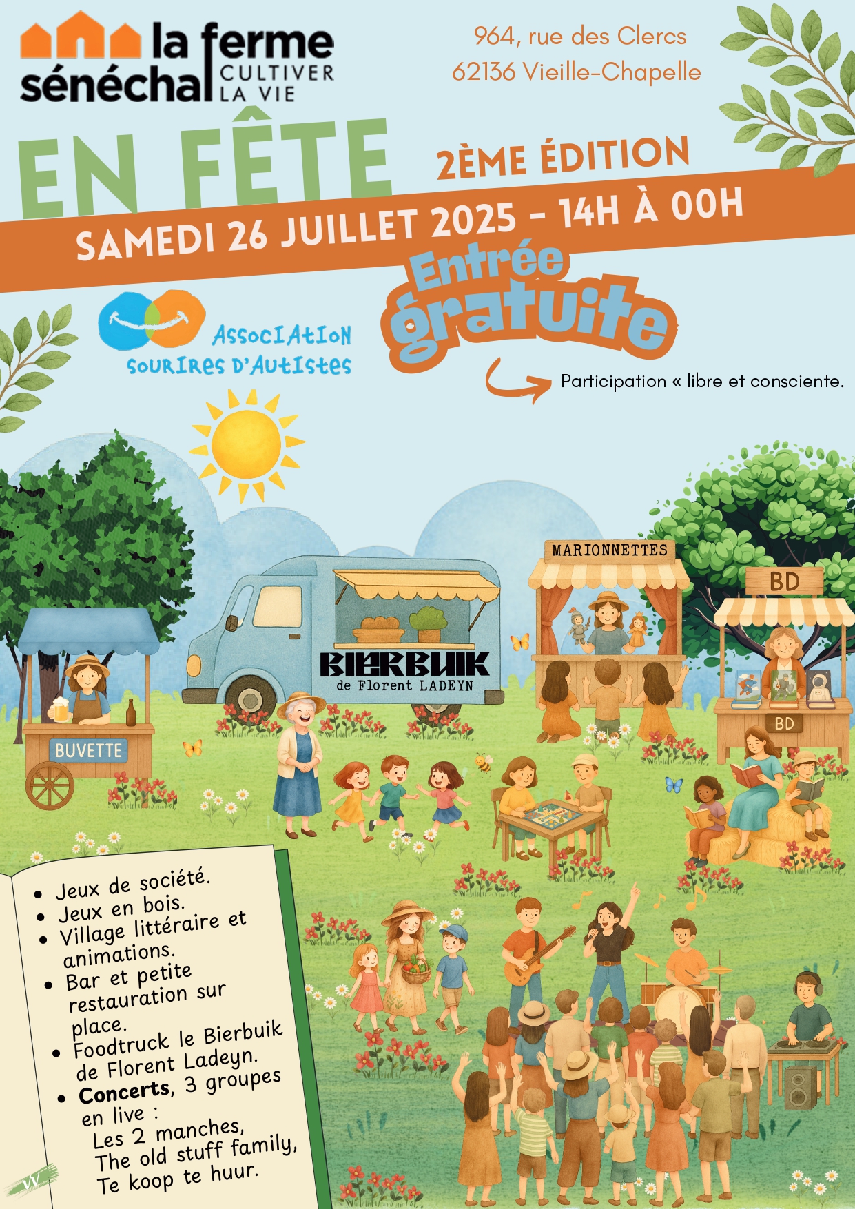 Du 26 Jul - 27 Jul La ferme Sénéchal - Vieille-Chapelle / Vieille-Chapelle 14h - 09h Concert Ferme Sénéchal en fête Rendez-vous le 26 juillet de 14h à 00h - Entrée Gratuite Ajouter au calendrier Public : Tout public Jeux de société Jeux de bois Bar et restauration sur place Concert avec 3 groupes en live Localiser Choice of plan Fermer Precedent Retour à la liste Suivant