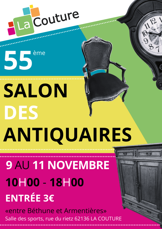 Du 09 Nov - 11 Nov Mairie de La Couture / La Couture 10h - 18h Événement Salon des Antiquaires SALON DES ANTIQUAIRES Ajouter au calendrier Public : Tout public Salle des sports, rue du riez 62136 LA COUTURE Renseignements en Mairie 03.21.26.26.81 Localiser Choice of plan Fermer Precedent Retour à la liste Suivant
