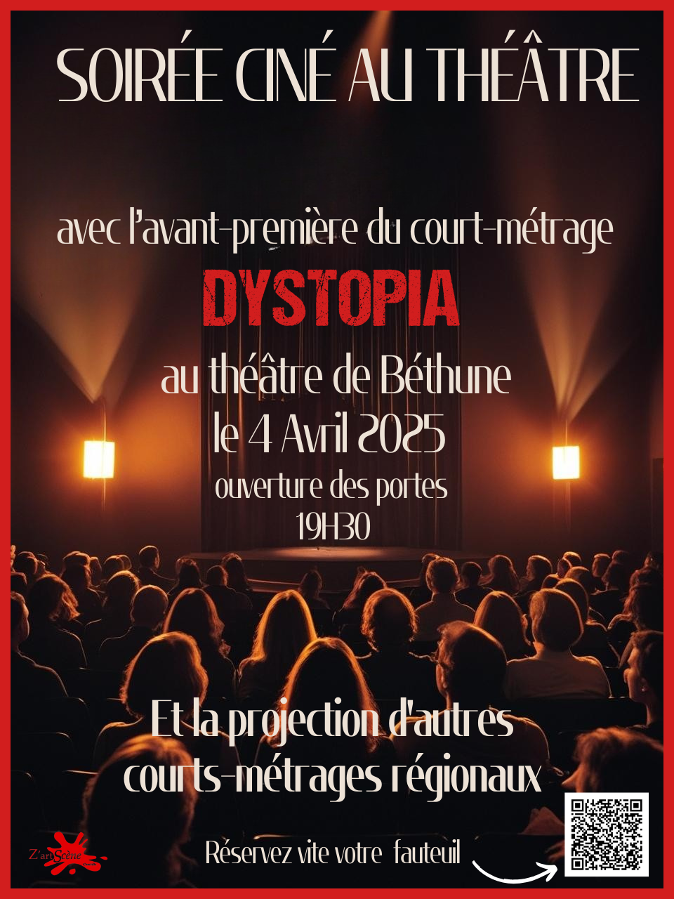 Une soirée ciné au théâtre ça vous dit ? A l'occasion de l'avant-première du court-métrage "DYSTOPIA", réalisé dans le béthunois en 2024, l'équipe du film en profite pour vous concocter une soirée de diffusion de courts-métrages variés (animation, drame, comédie...) de réalisateurs amateurs, étudiants ou professionnels de la Région des Hauts de France. L'occasion de découvrir l'univers du court-métrage, et de vous transporter l'instant de quelques minutes dans différentes thématiques dans un lieu magnifique qu'est le théâtre municipal de Béthune. Prenez place pour un voyage cinématographique le 4 Avril 2024 au soir pour 1 euro, vous avez bien lu, 1 euro ! Il y aussi la possibilité de faire un don pour soutenir l'inscription du film sur le chemin des Festivals, mais bien sûr, ce n'est pas une obligation 😉 Enfants bienvenus => conseillé à partir de 8 ans Pour la place, c'est ici que ça se passe : https://www.helloasso.com/associations/z-artscene-comedie/evenements/court-en-nord-au-theatre Vous voulez en savoir plus sur le court-métrage "Dystopia" ? C'est par ici : https://www.facebook.com/share/19pp7w8oSV/ Belle journée à tous.