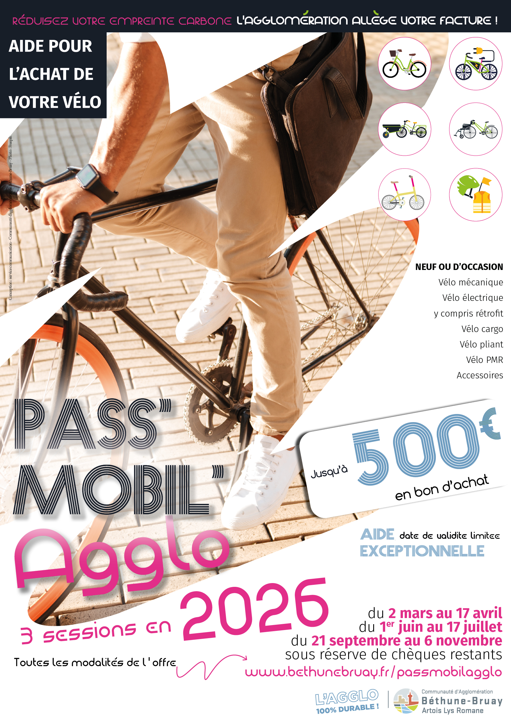 Dans l’optique de développer une mobilité vertueuse, l’Agglo travaille à faire progresser la part modale des déplacements dits « doux », alternatifs aux déplacements motorisés. La Communauté d’agglomération de Béthune- Bruay, Artois Lys Romane renouvelle son Pass’Mobil’Agglo, l'aide financière à l’achat de vélo.