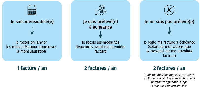La première facture sera émise à partir d’avril 2026, pour la période de consommation à compter du 1er janvier. Si vous ne la recevez pas dès le printemps, ne vous inquiétez pas ! La facturation est échelonnée sur toute l’année selon le secteur et la tournée de relève de rattachement. Votre période de facturation vous sera communiquée par courrier courant janvier.