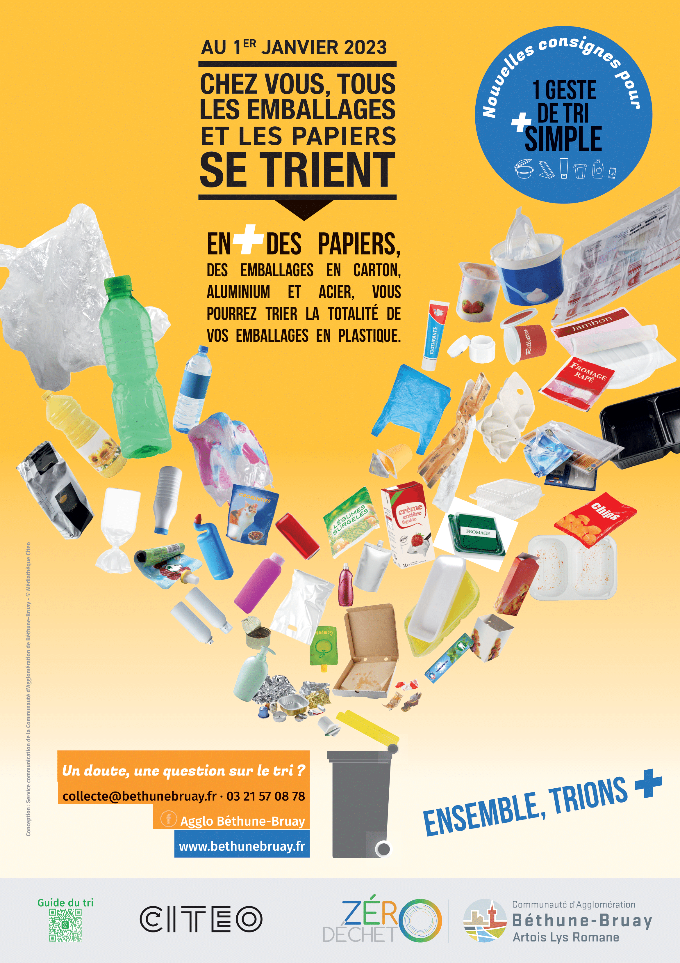 A compter du 1er janvier 2023, chez vous, tous les emballages et les papiers se trient. En plus des papiers, des emballages en carton, aluminium et acier, vous pourrez trier la totalité de vos emballages en plastique.