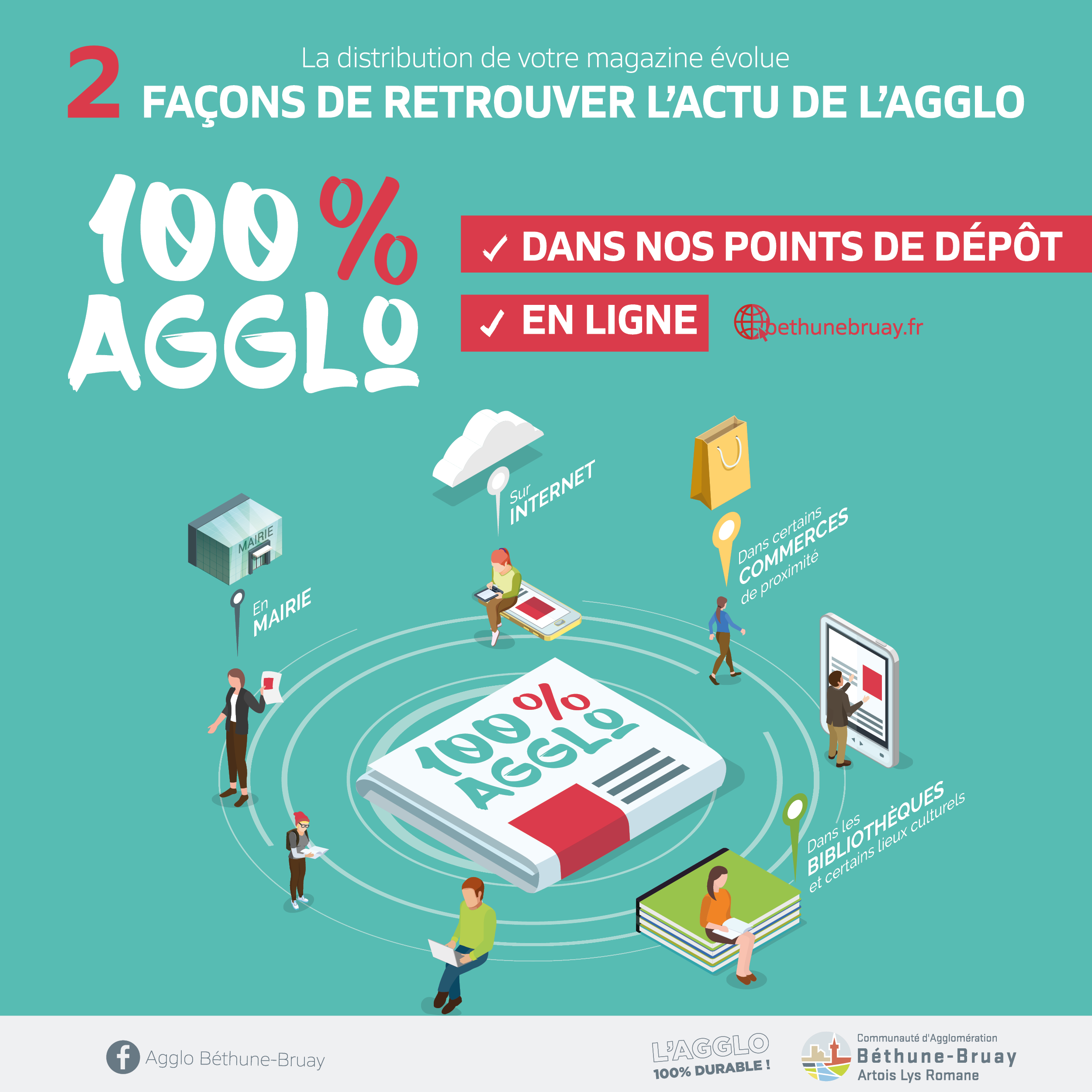 Pour rester informé de toute l’actualité de votre territoire, rien de plus simple : vous pouvez trouver le magazine "100 % Agglo" dans vos commerces de proximité, votre mairie, votre bibliothèque ou vos lieux culturels favoris !