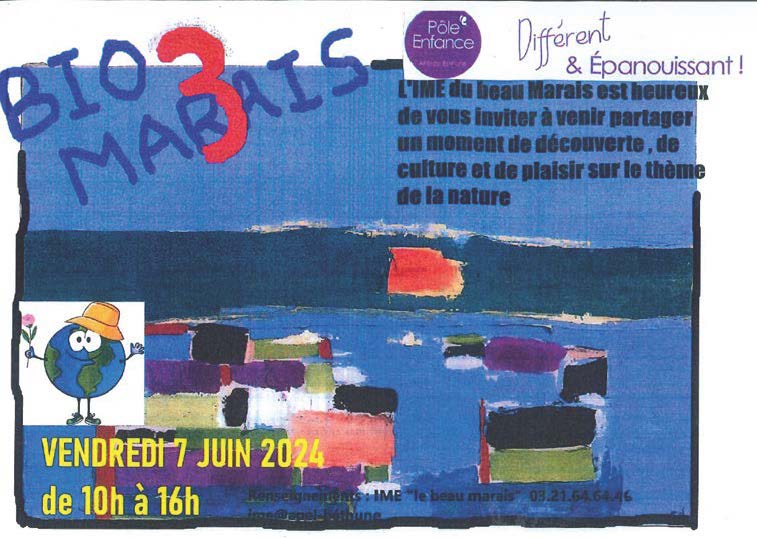 Les enfants, adolescents et professionnels de l’IME « Le beau Marais » ont développé un projet autour du respect de la nature, de l’environnement et du développement durable. Ce projet a permis de faire émerger beaucoup d’idées écologiques qui ont par la suite été mises en place au sein de la structure : jardin partagé, aménagement d’un poulailler, fabrication de bac de compostage, collectes de produits recyclables, hôtel à insectes… Afin de faire découvrir leur cheminement et la mise en place de leur activité, ils ont créé un évènement : Bio Marais. Comme chaque année, l’IME de Beuvry accueillera les écoles « ordinaires » (maternelle, primaire et collège) ainsi que les établissements médico-éducatif du territoire à s’amuser et réfléchir autour de la thématique homme-nature. Un évènement devenu incontournable avec 2 objectifs principaux : l’inclusion d’une part et la réflexion autour du développement durable d’autre part. Au programme : stand de produits « seconde vie » et de produits locaux, jeux, ateliers, courses d’orientation, démonstrations et partage d’expérience. Rendez-vous donc le 7 juin de 10h à 16h à l’IME Le beau Marais 1749 Rue Lucien Trinel, 62660 Beuvry Lien d’inscription : https://forms.gle/muy8YjqfmEcnUQM7A