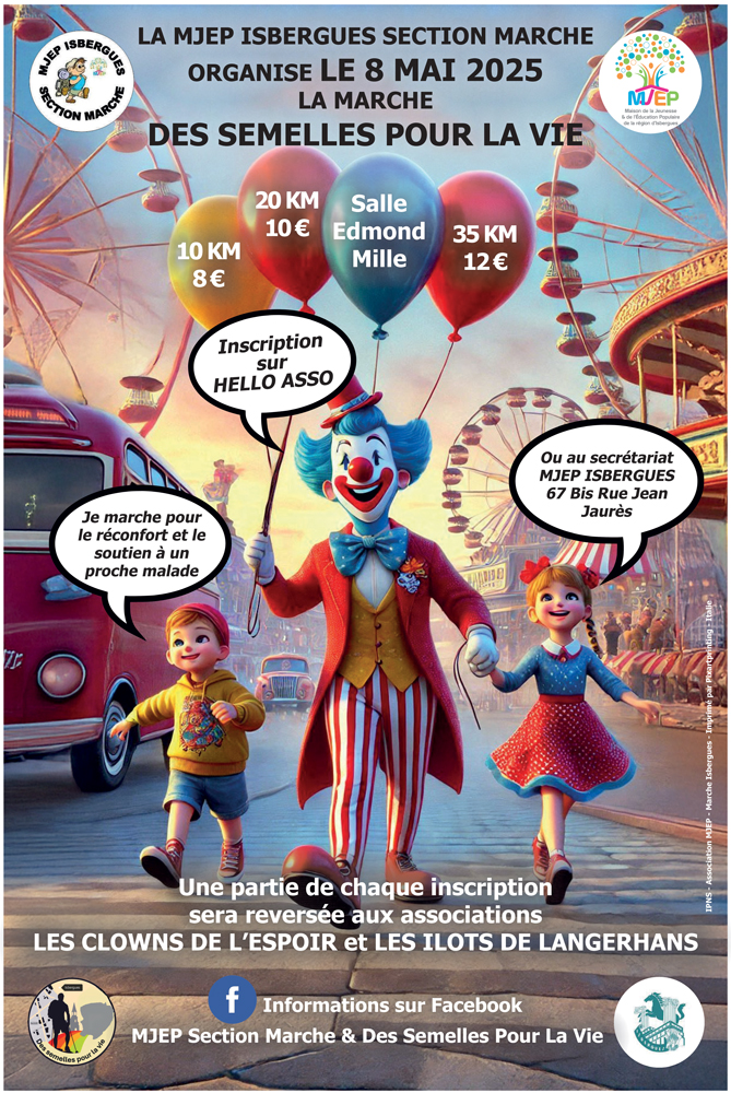 Chaque marcheur apportera à un proche ou à un ami son réconfort et son soutien3 randonnées. Départ salle Edmond Mille à Isbergues. 35 km "les téméraires" (3 ravitaillements) 20km "Les courageux" (2 ravitaillements) 10 km "Les gentils prudents plein d'amour" (1 ravitaillement) Inscription sur HelloAsso (Taper dans la barre "mjep section marche") OU au secrétariat de la MJEP d'Isbergues