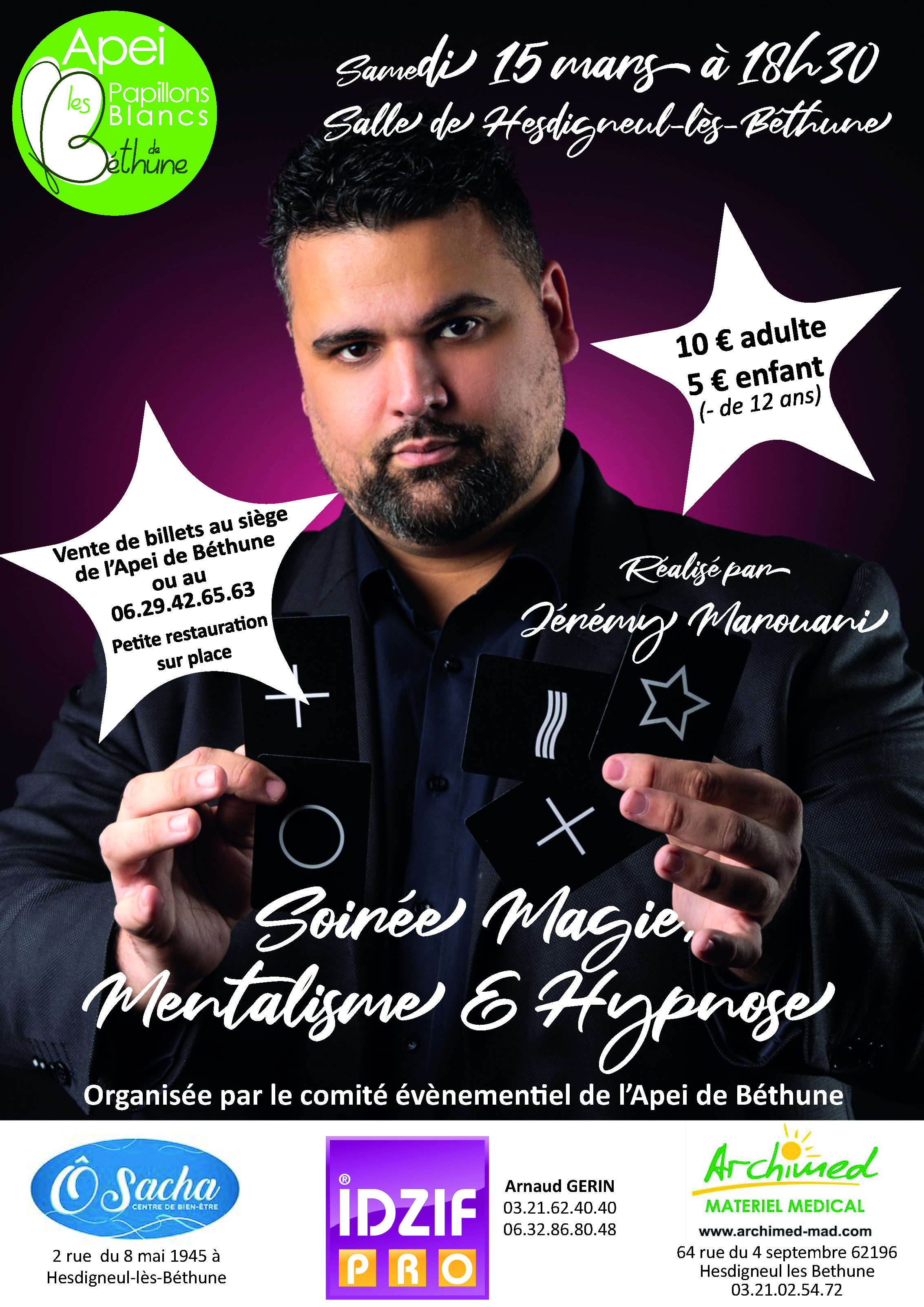 Rendez-vous le 15 mars, 18h30 à la salle de Hesdigneul-lès-Béthune pour le spectacle de « Magie, Mentalisme et Hypnose » organisé par le comité évènementiel de l’Apei de Béthune. Les places sont en vente directement au siège de l’Apei de Béthune : - 10 euros pour les adultes - 5 euros les enfants (de moins de 12 ans)