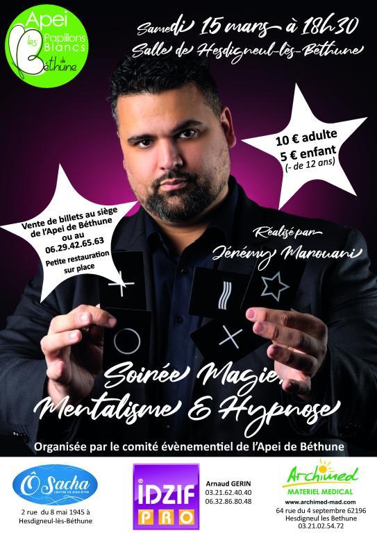 Rendez-vous le 15 mars, 18h30 à la salle de Hesdigneul-lès-Béthune pour le spectacle de « Magie, Mentalisme et Hypnose » organisé par le comité évènementiel de l’Apei de Béthune.