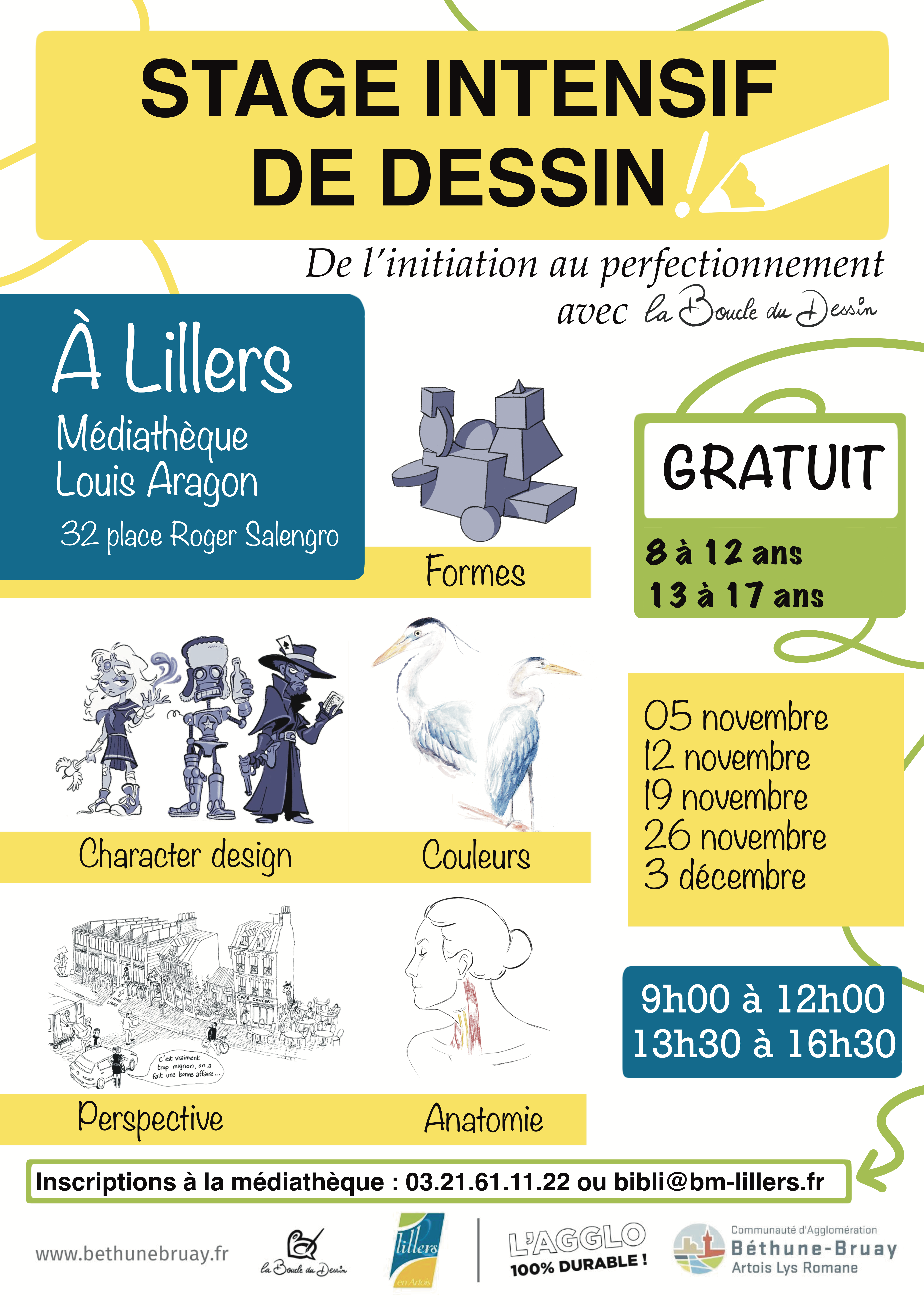 Vous apprendrez différentes techniques et perfectionnerez votre coup de crayon. Différentes thématiques seront abordées : le portrait, la couleur, la perspective, l’anatomie, le design character…. de 9h à 12h pour les 8/12 ans de 13h30 à 16h30 pour les 13/17 ans Animé par les bédéistes de la Maison d’édition La Boucle du dessin- Proposé par la CABBALR Enfants/Ados Gratuit sur réservation 03 21 61 11 22 ou bibli@bm-lillers.fr