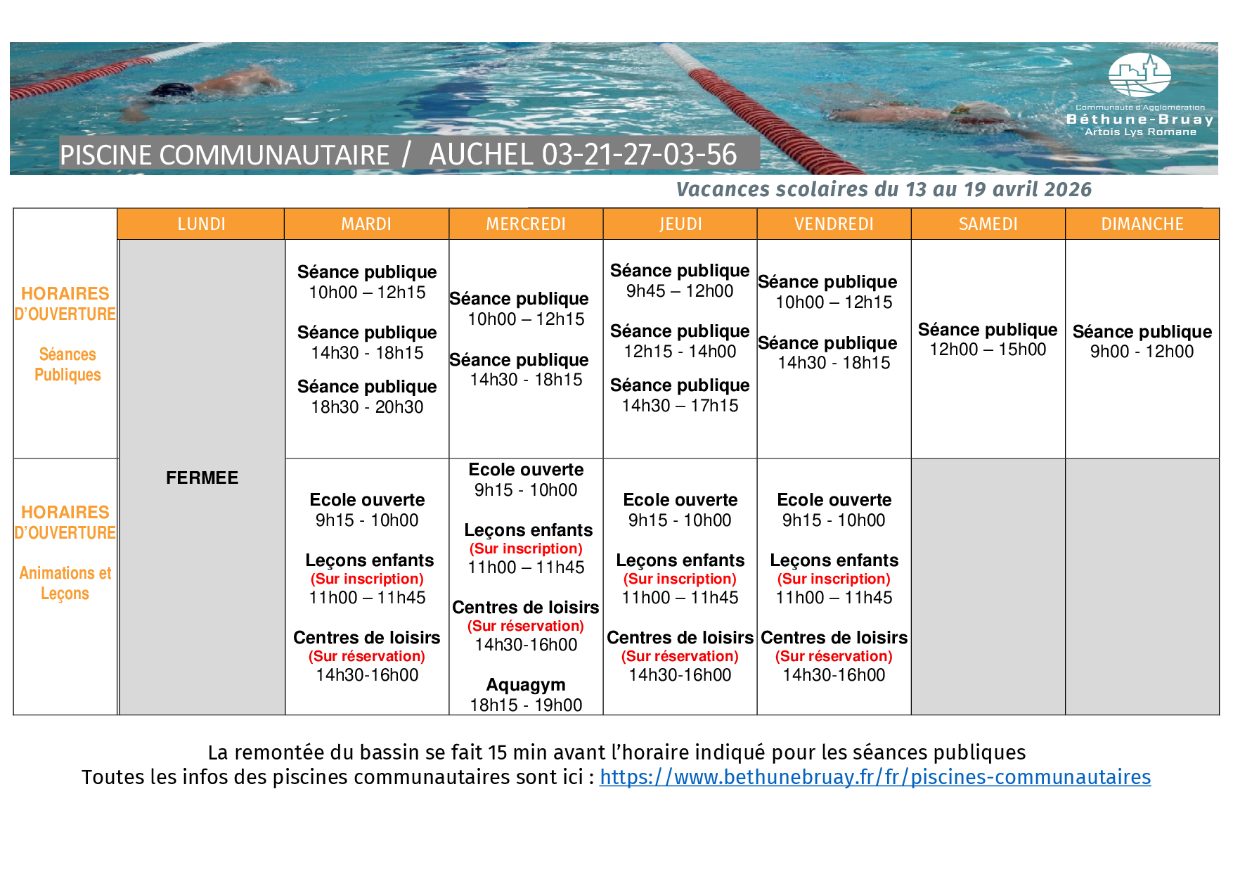 Fermeture exceptionnelle de la piscine d'AUCHEL pour compétitions le dimanche 26 avril 2026 et le dimanche 31 mai 2026.