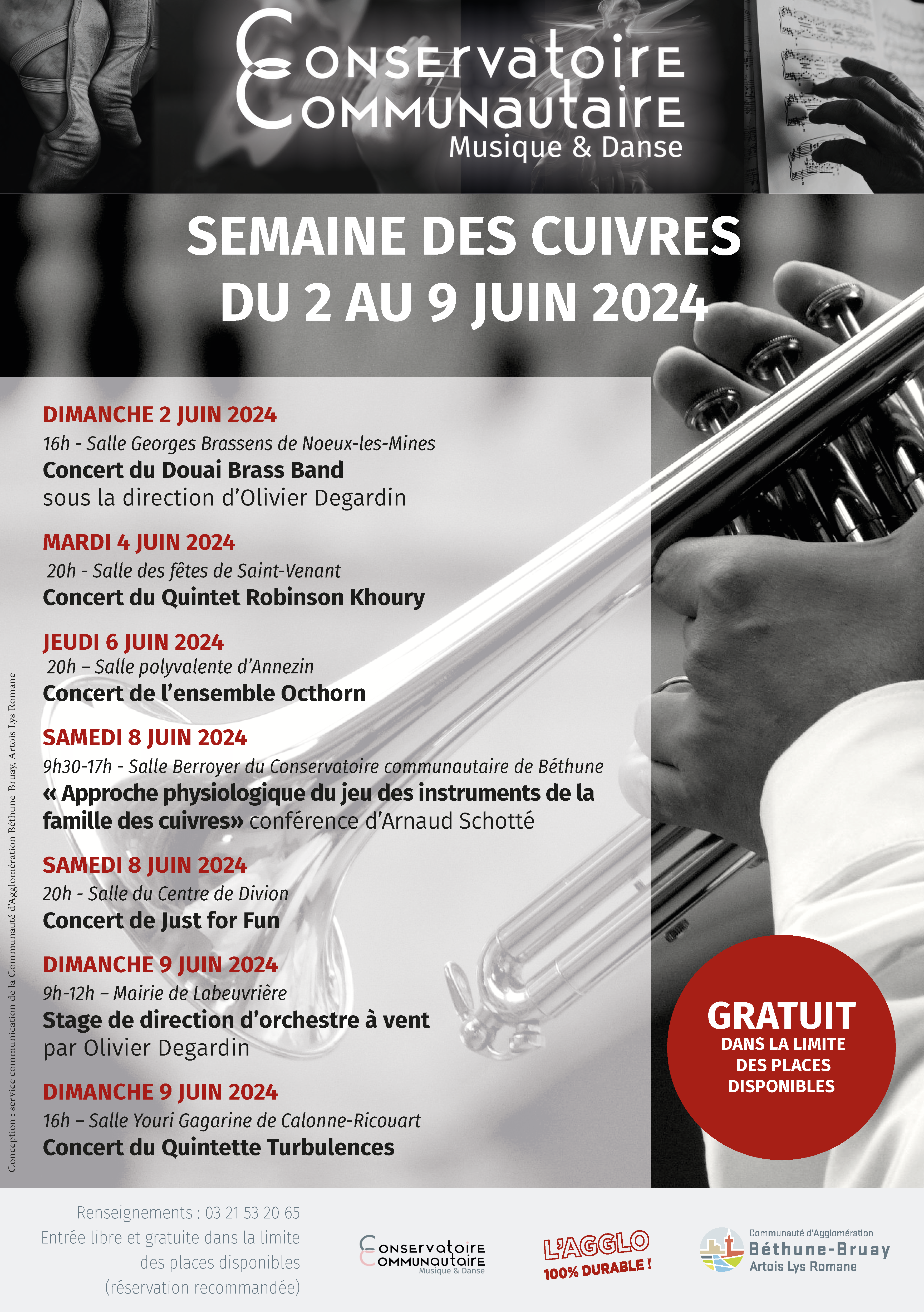 • Samedi 8 juin - 9h30-17h : Conférence autour de l'approche physiologique du jeu des instruments de la famille des cuivres par Arnaud Schotté